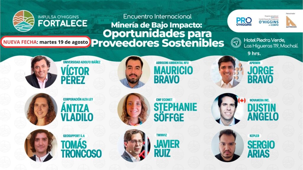 Promover soluciones sostenibles y oportunidades de desarrollo para proveedores vinculados a la minería, es el propósito del Encuentro Internacional “Minería de Bajo Impacto: Oportunidades para Proveedores Sostenibles” organizado por Corporación Pro O’Higgins y Corfo, con el patrocinio de Aprimin; evento que luego de ser reprogramado, tendrá lugar el martes 19 de agosto, desde las 9:00 horas en el Hotel Piedra Verde, ubicado en Las Higueras 119, Machalí.