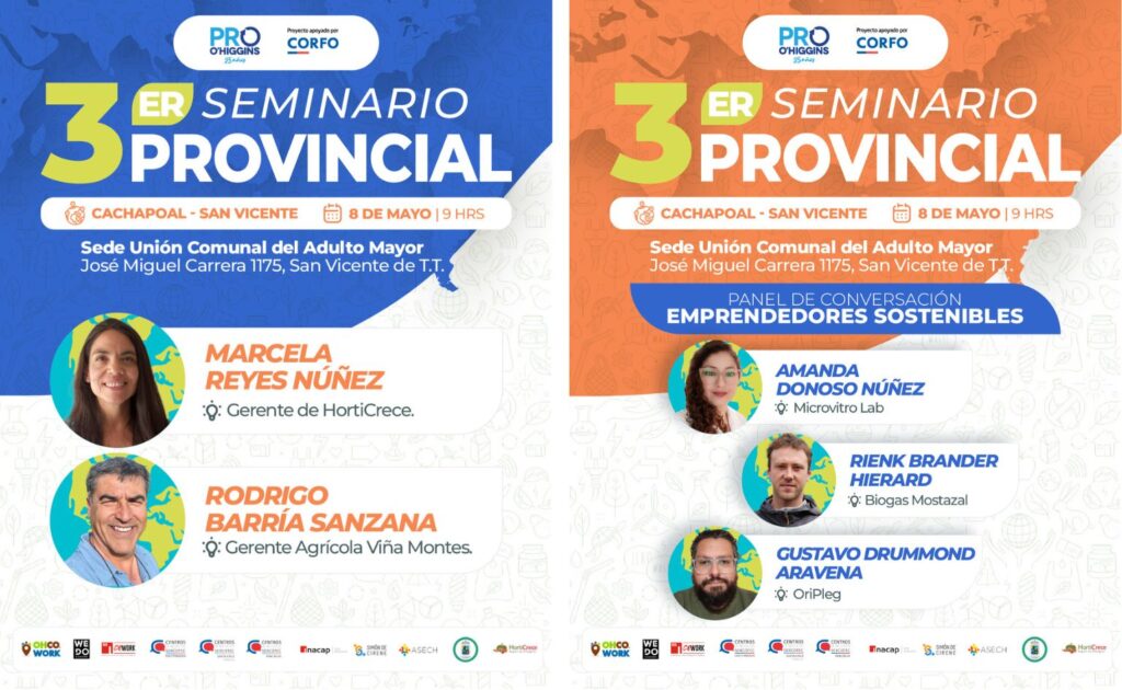 Un nuevo seminario provincial de emprendimientos innovadores, se realizará en el desarrollo del programa Impulsa O’Higgins Sostenible que Pro O’Higgins ejecuta con el cofinanciamiento de Corfo. Esta vez, la cita es para la provincia de Cachapoal, el miércoles 8 de mayo desde las 9 hrs en la comuna de San Vicente de Tagua Tagua, en la sede de unión comunal del Adulto Mayor, ubicada en José Miguel Carrera 1175.